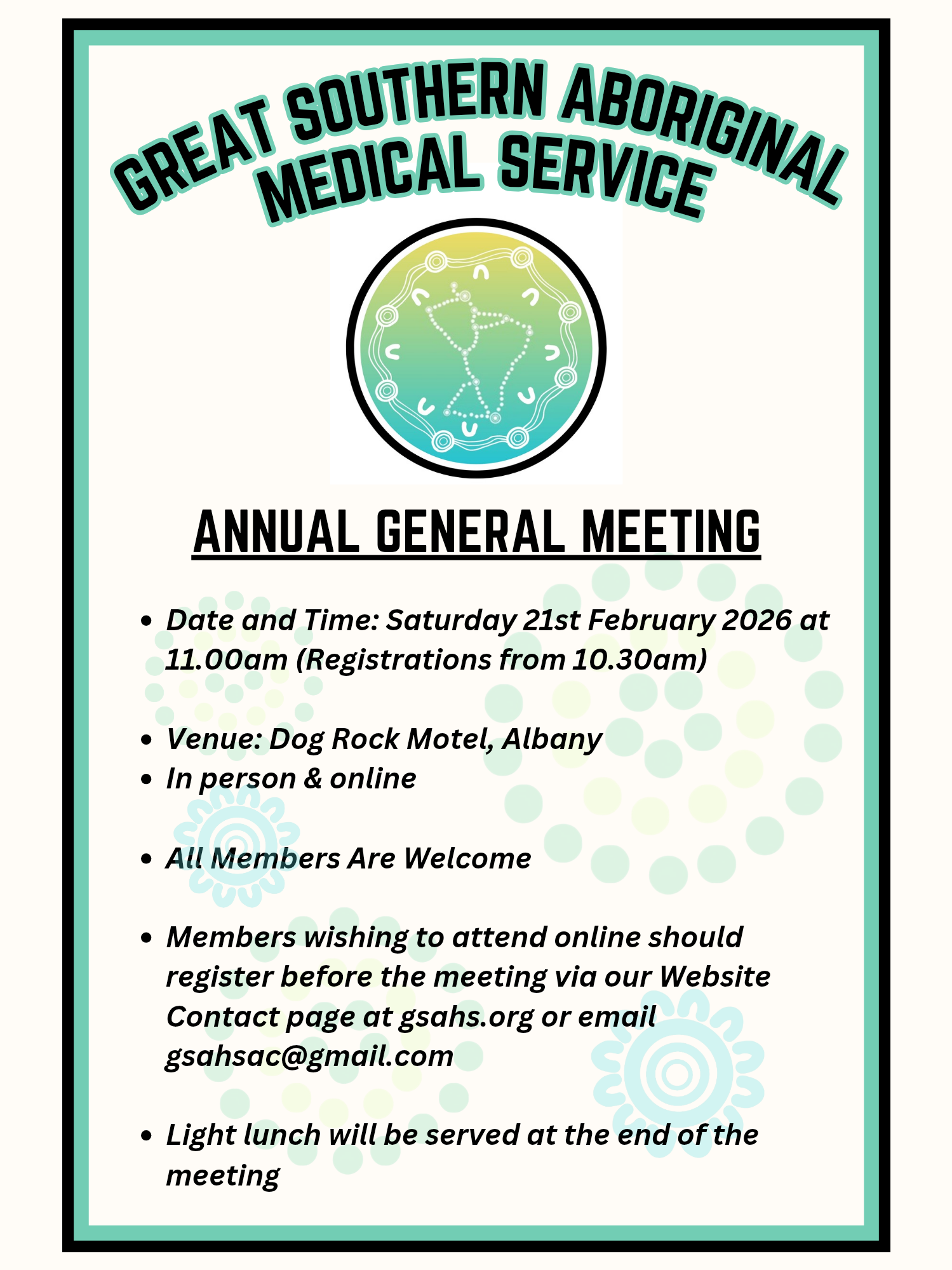 Notice is hereby given that the 2025 Annual General Meeting (AGM) of the members of the Great Southern Aboriginal Medical Service Aboriginal Corporation (“GSAMS”) will be held as follows: